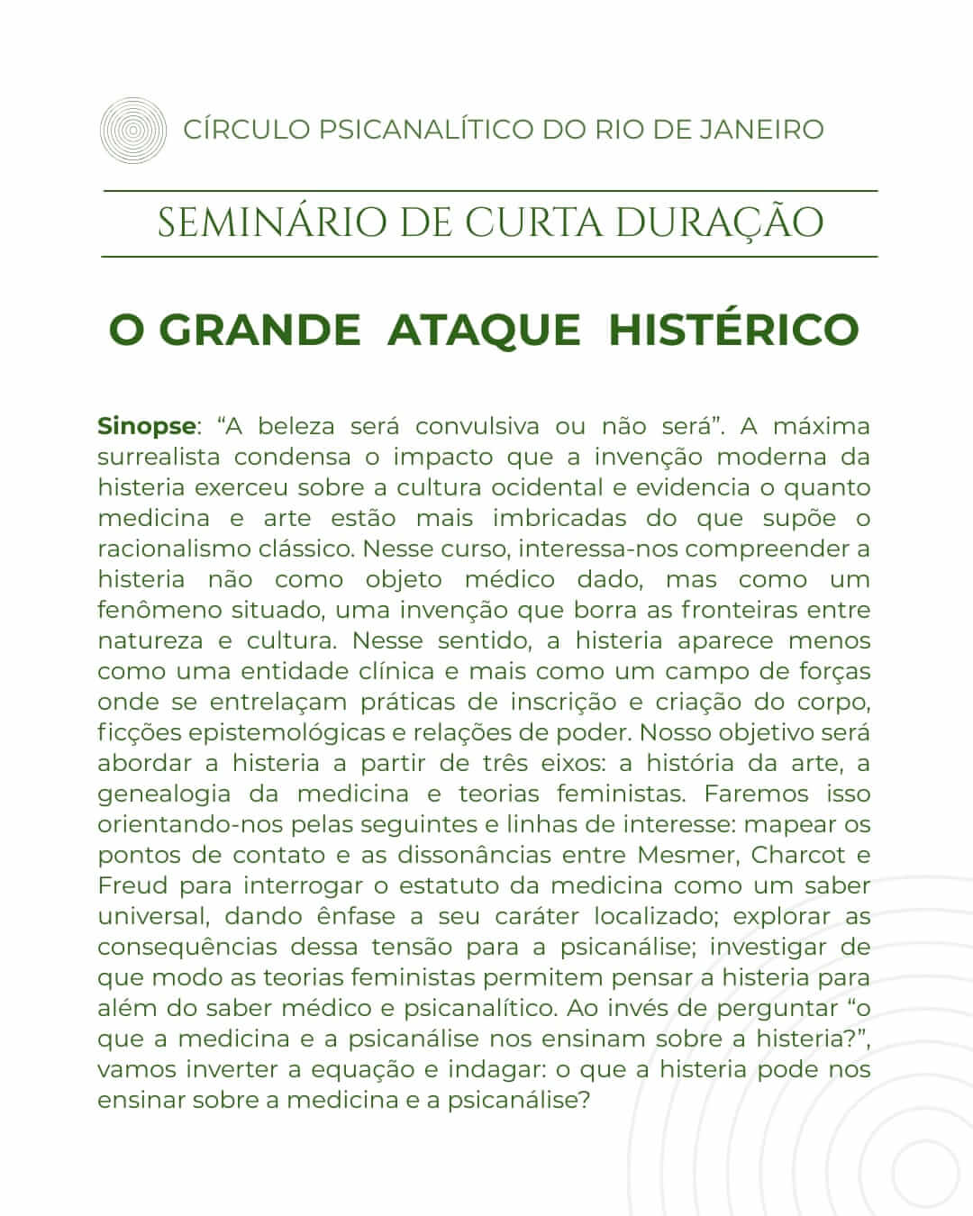 A cada ano, a Comissão de Formação Permanente do CPRJ escolhe um tema que irá nortear nossas reflexões e inspirar nossos encontros. Esta escolha busca contemplar questões e impasses em evidência na cultura e no dia a dia da clínica psicanalítica e que demandem maior aprofundamento, outras abordagens e novas articulações teóricas e clínicas. Dentro desta perspectiva, todas as mesas-redondas e conferências que acontecem no ano, bem como os Cadernos de Psicanálise do CPRJ são dedicados ao tema escolhido naquele ano.